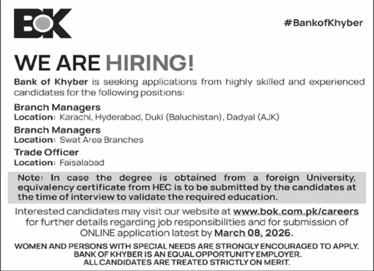 Bank of Khyber Branch Managers & Trade Officer Jobs