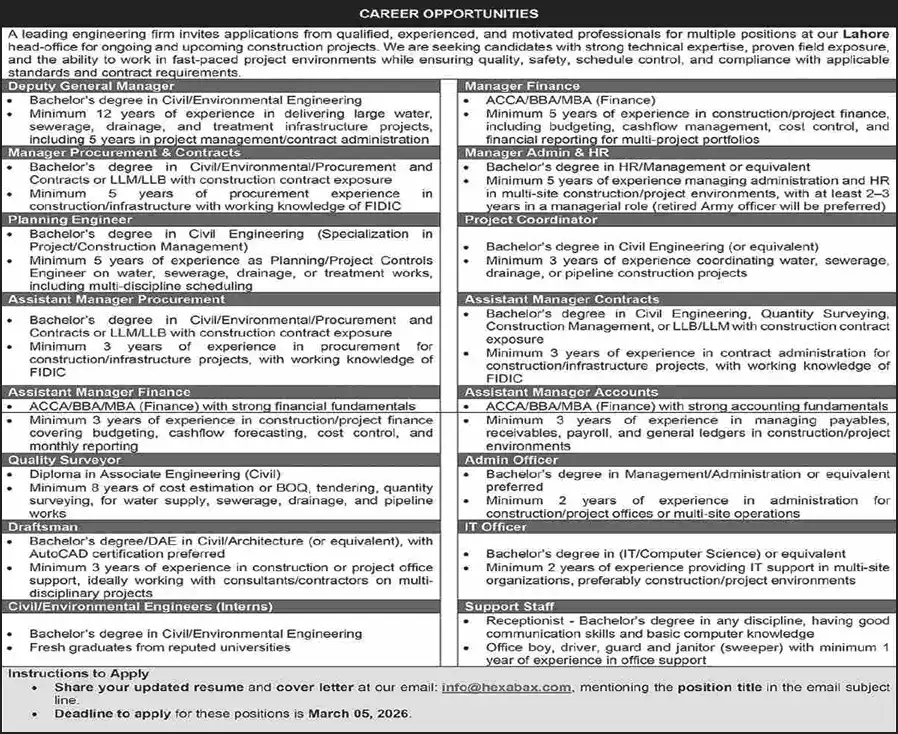 Hexabax Lahore Assistant Managers, Admin / IT Officers Jobs
